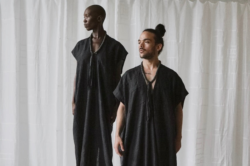 long rope of black leather sequins on a leather cord with matching deerskin tassel. each sequin is cut individually and strung by hand from veg tan leather. the tassel is hand cut and wrapped from deerskin leather.