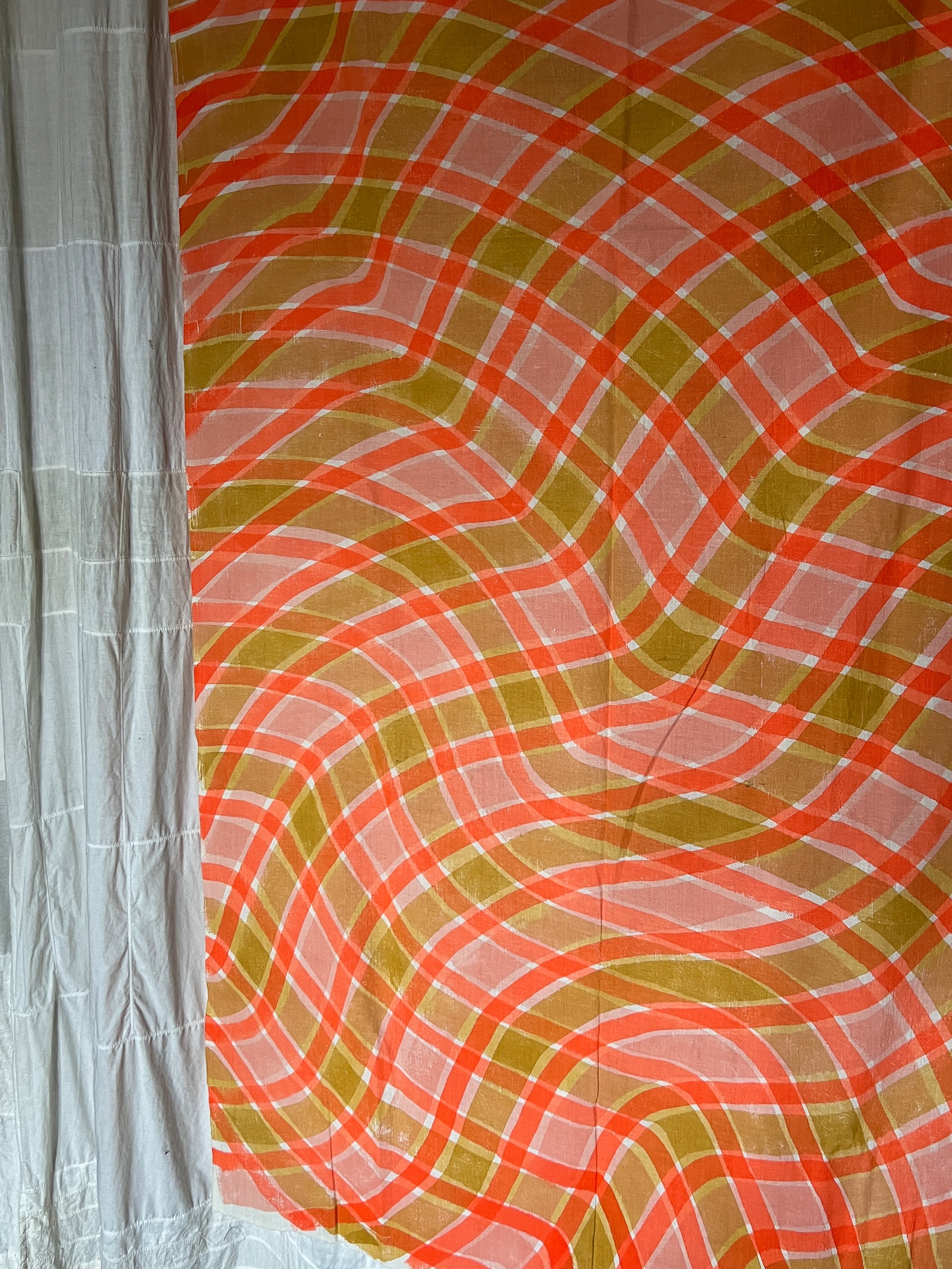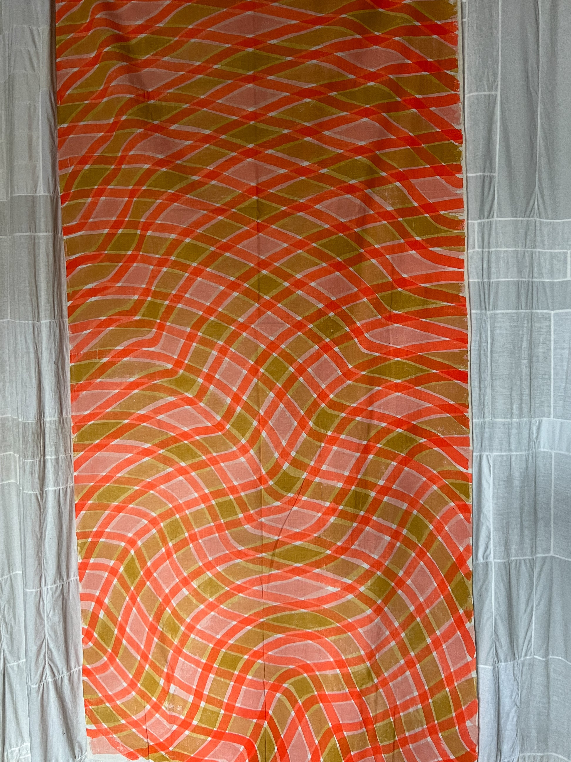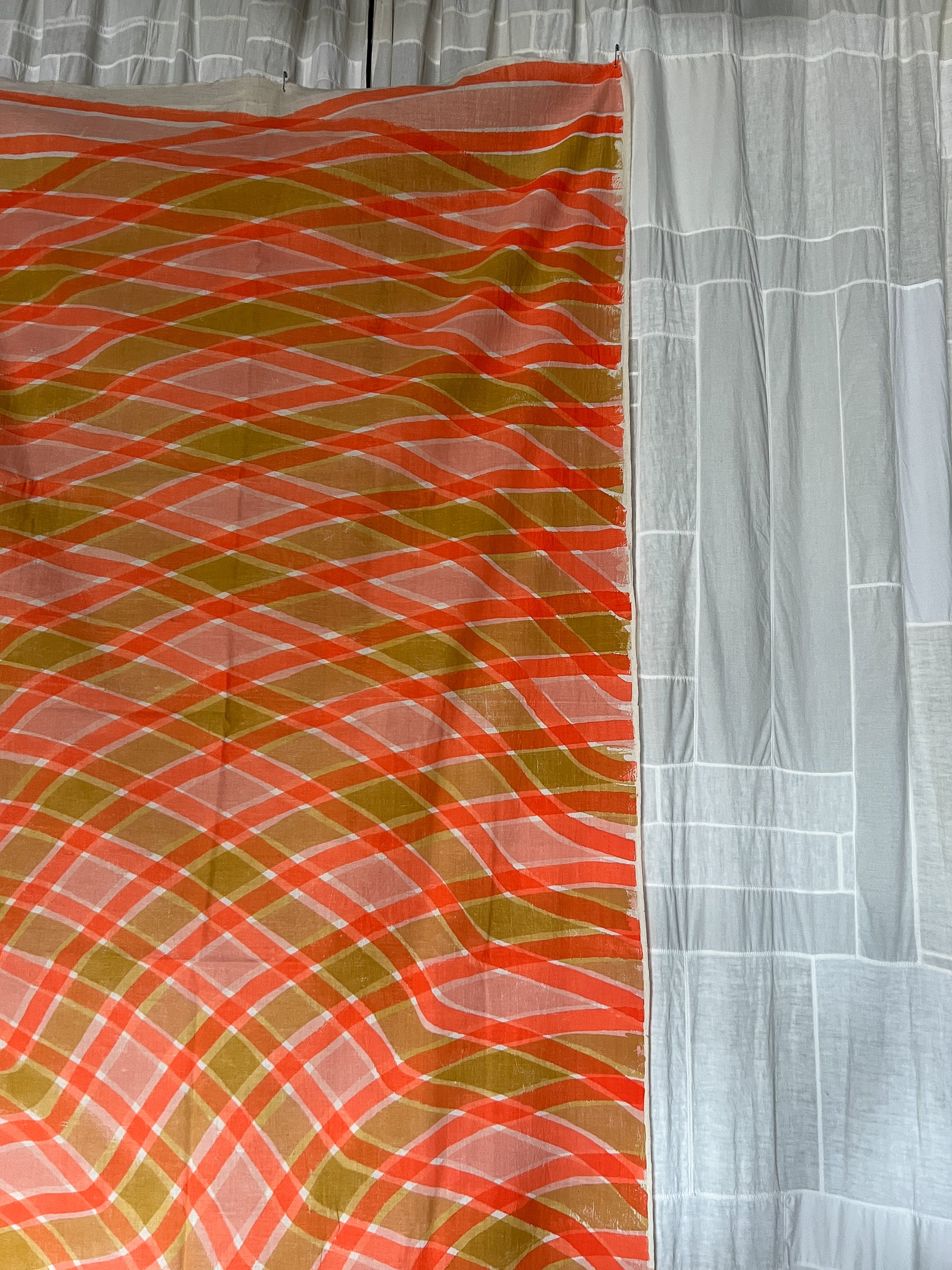 In a signature Camilla Mustard color combination, hand-painted stripes of crimson, peach, and ochre crisscross over this fabric in a beautiful fluid plaid for A Love Letter to Water.