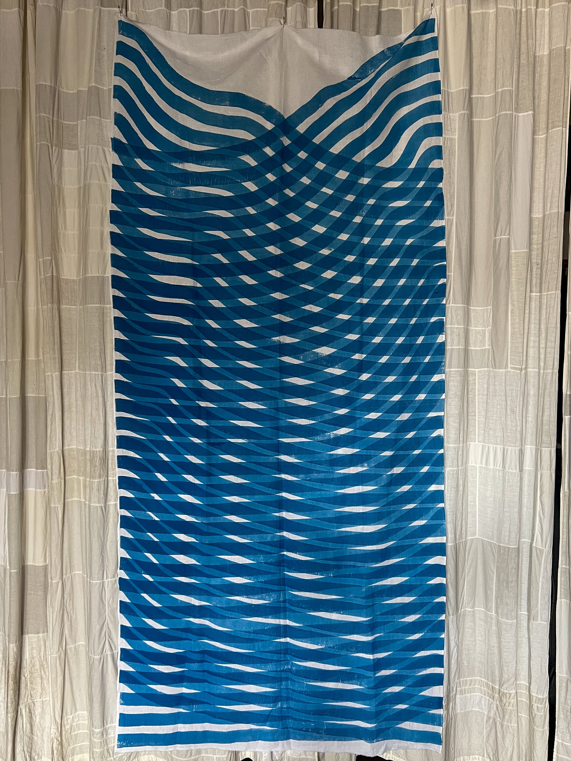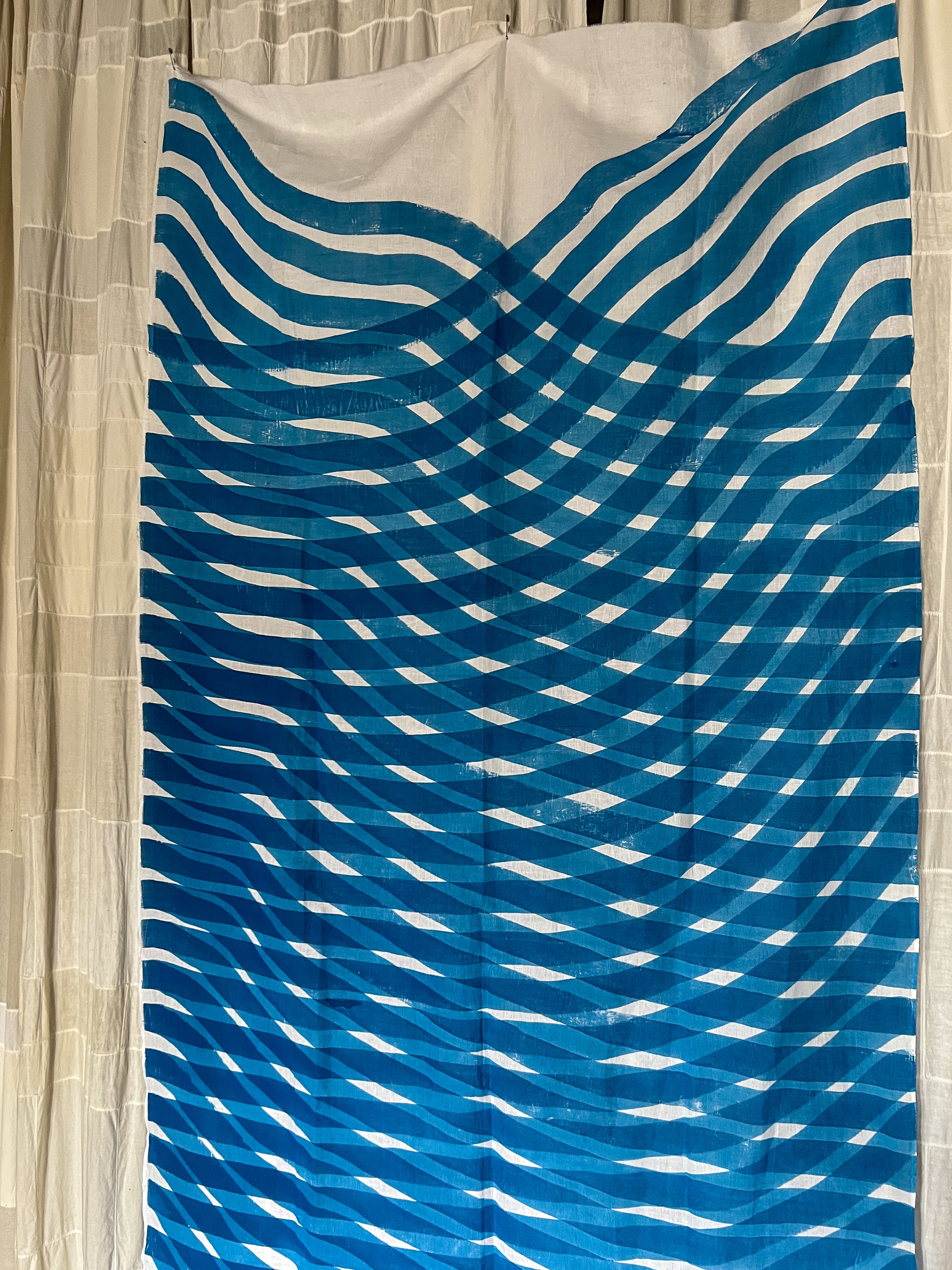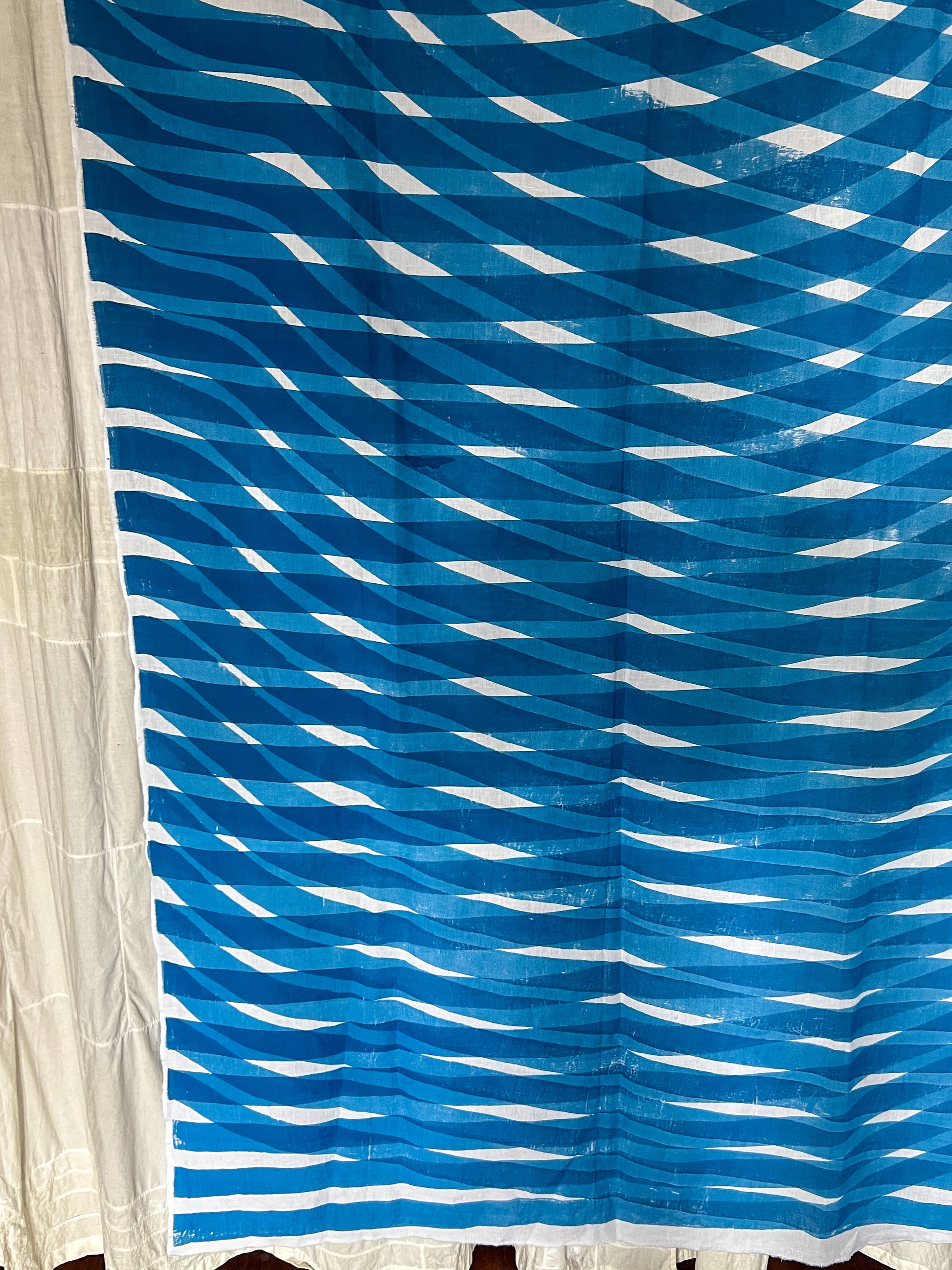 All blue, all the time, this piece is the ultimate love letter to water. Ripples of pacific blue cross over one another like waves on the shore. Created on our handloom woven cotton-linen blend, this fabric carries both the texture of the handloom and the artist’s expressive brushwork.