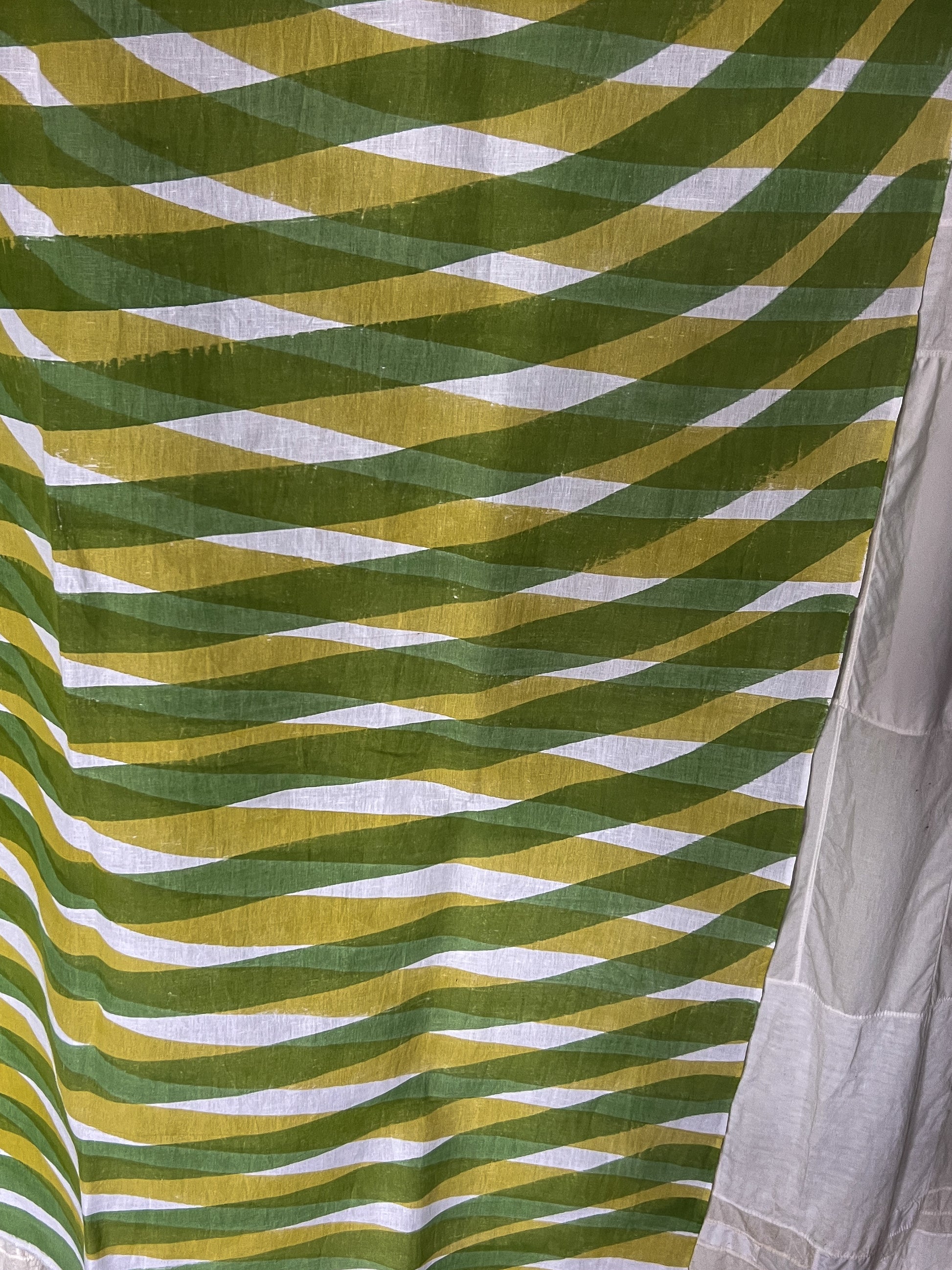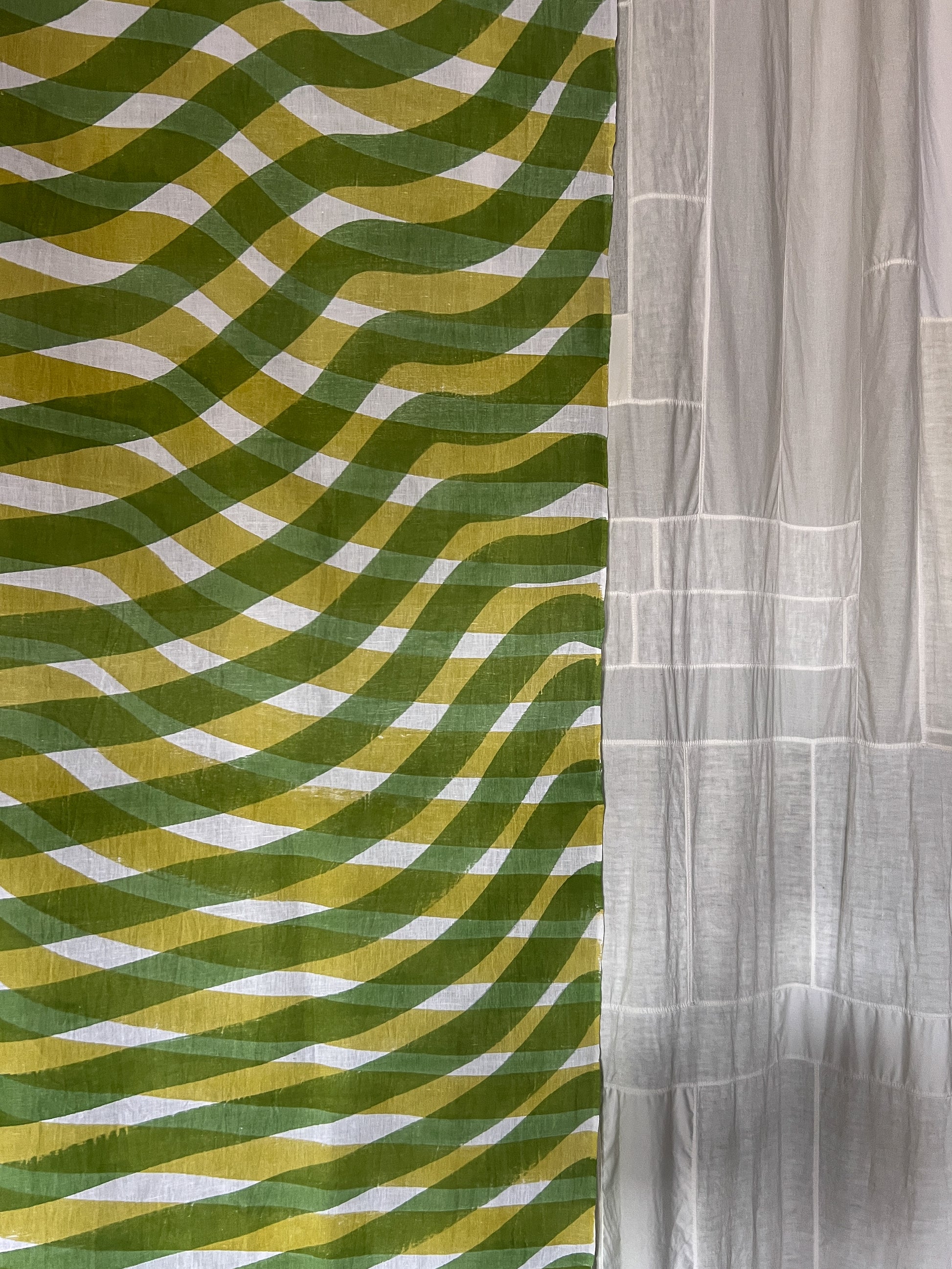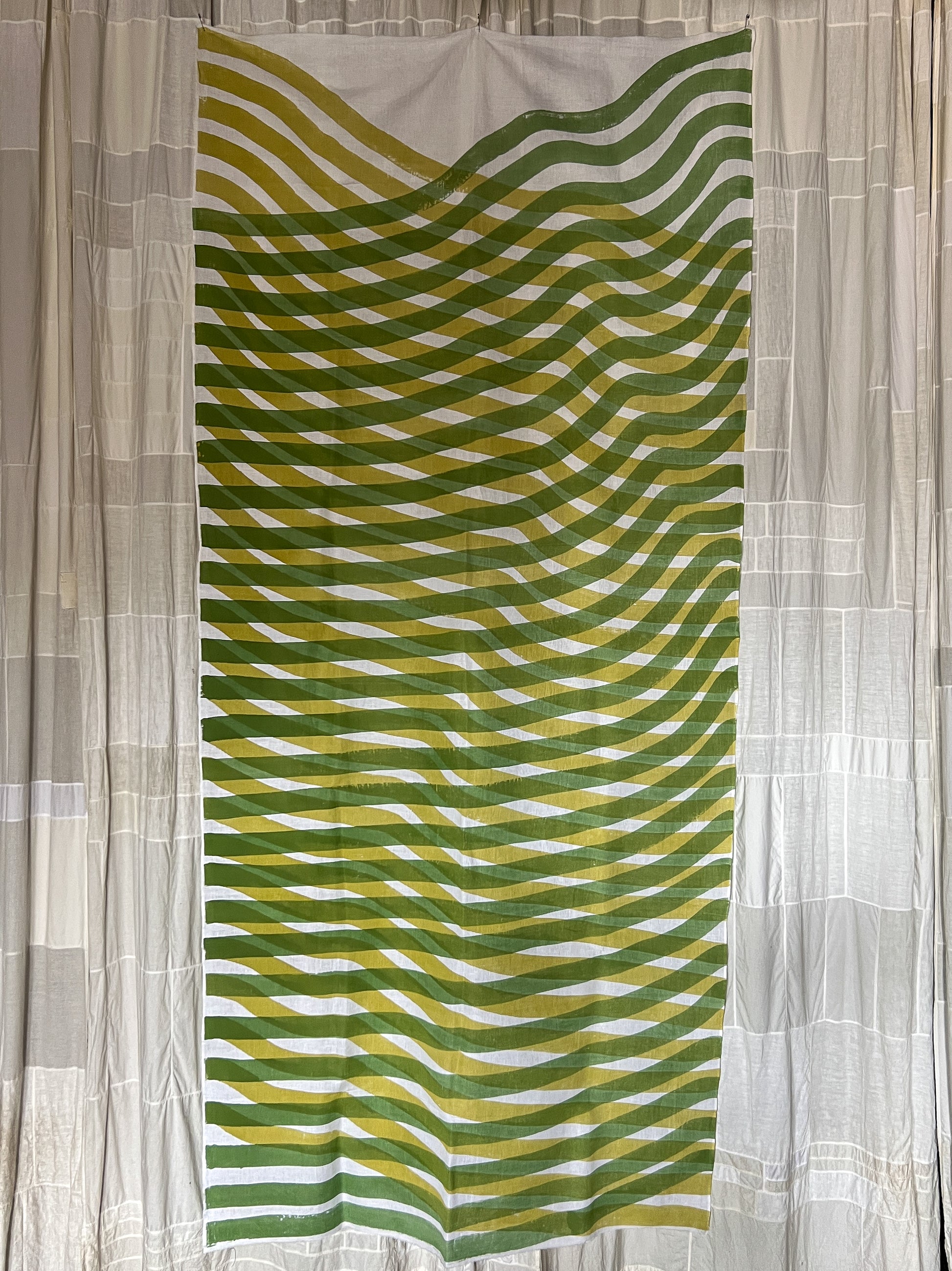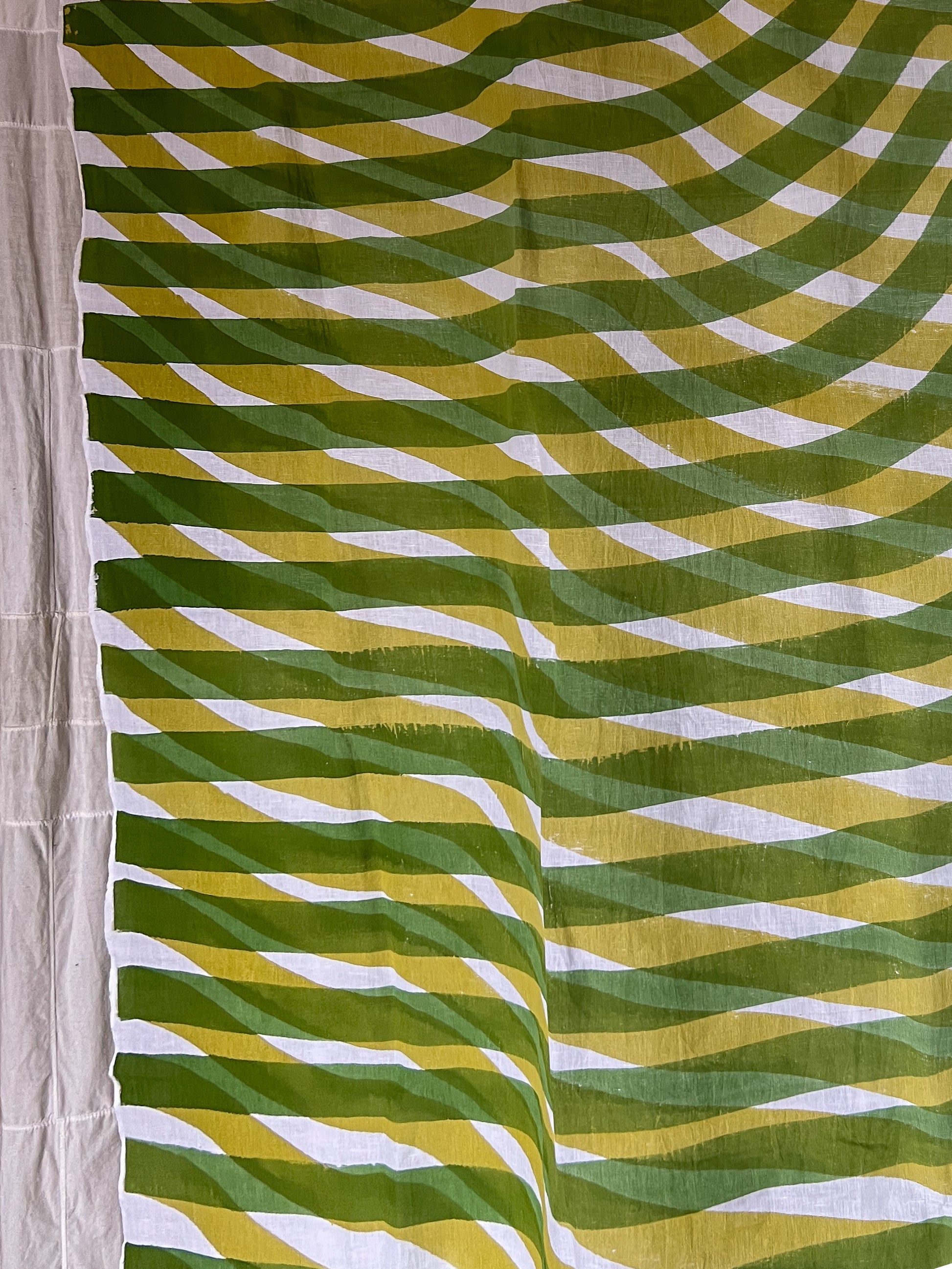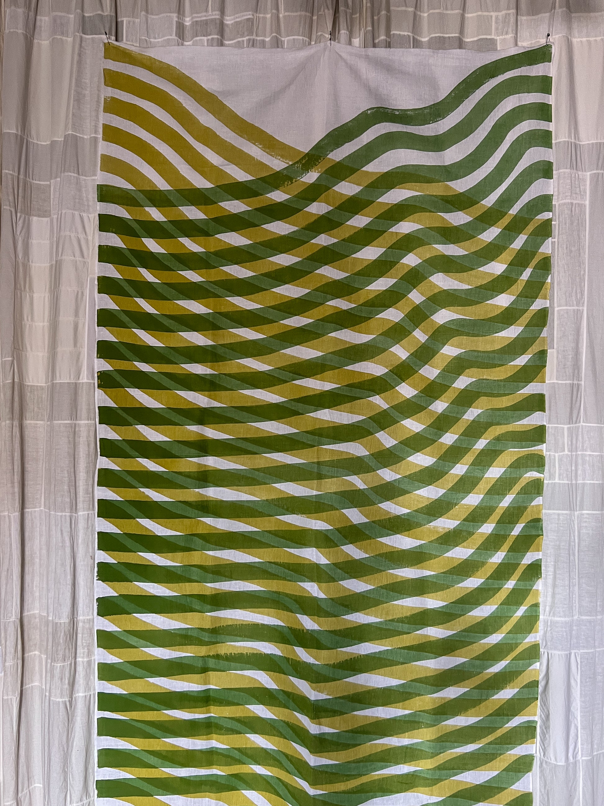 Hand-painted ripples of leaf green and clover crisscross over this fabric by Camilla Mustard for A Love Letter to Water. Created on a handloom woven cotton and linen blend fabric.