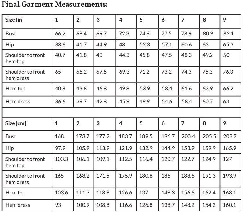 For the dress version, choose medium-weight knit fabrics or jerseys. For the top version, light and medium-weight fabrics with drape like viscose, Tencel, or linen blends work well. The dress sample is made in “Organic Basic Brushed Sweat” (100% cotton, 9.14 oz/310 gsm) and the top sample is made in “Urban Leo” (100% LENZING ECOVERO viscose, 4.87 oz/165 gsm). Both fabrics by METERMETER.