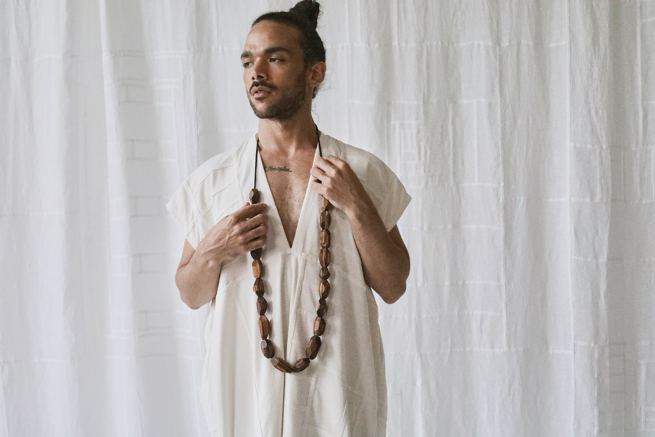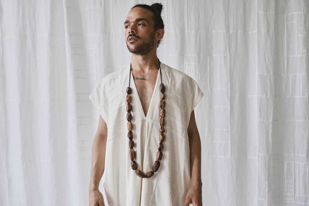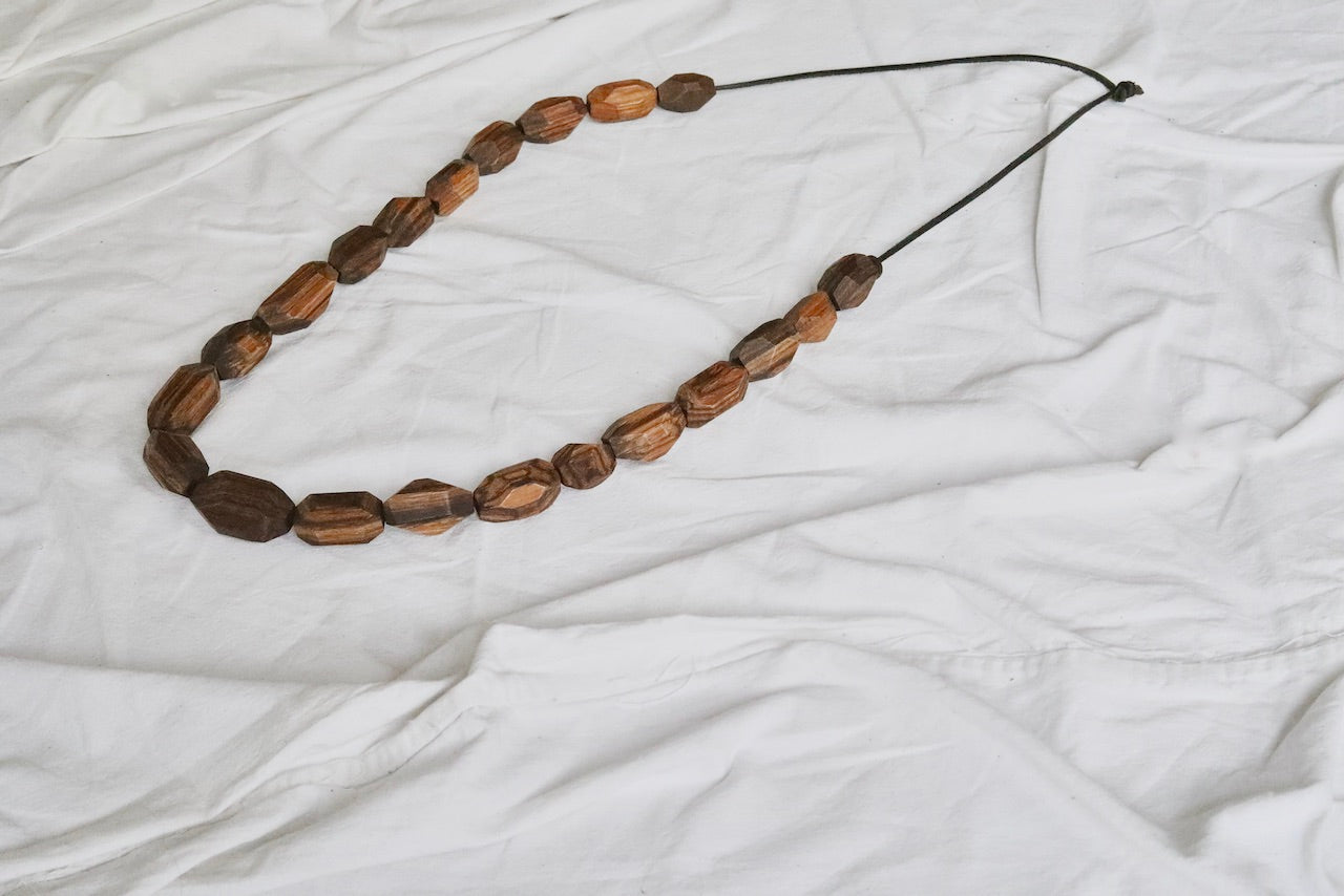 long necklace with zebra wood beads on a black leather cord. each bead is cut, drilled, shaped, and finished with mineral oil and beeswax polish one at a time by hand. this necklace is very long and measures about 54 inches around.