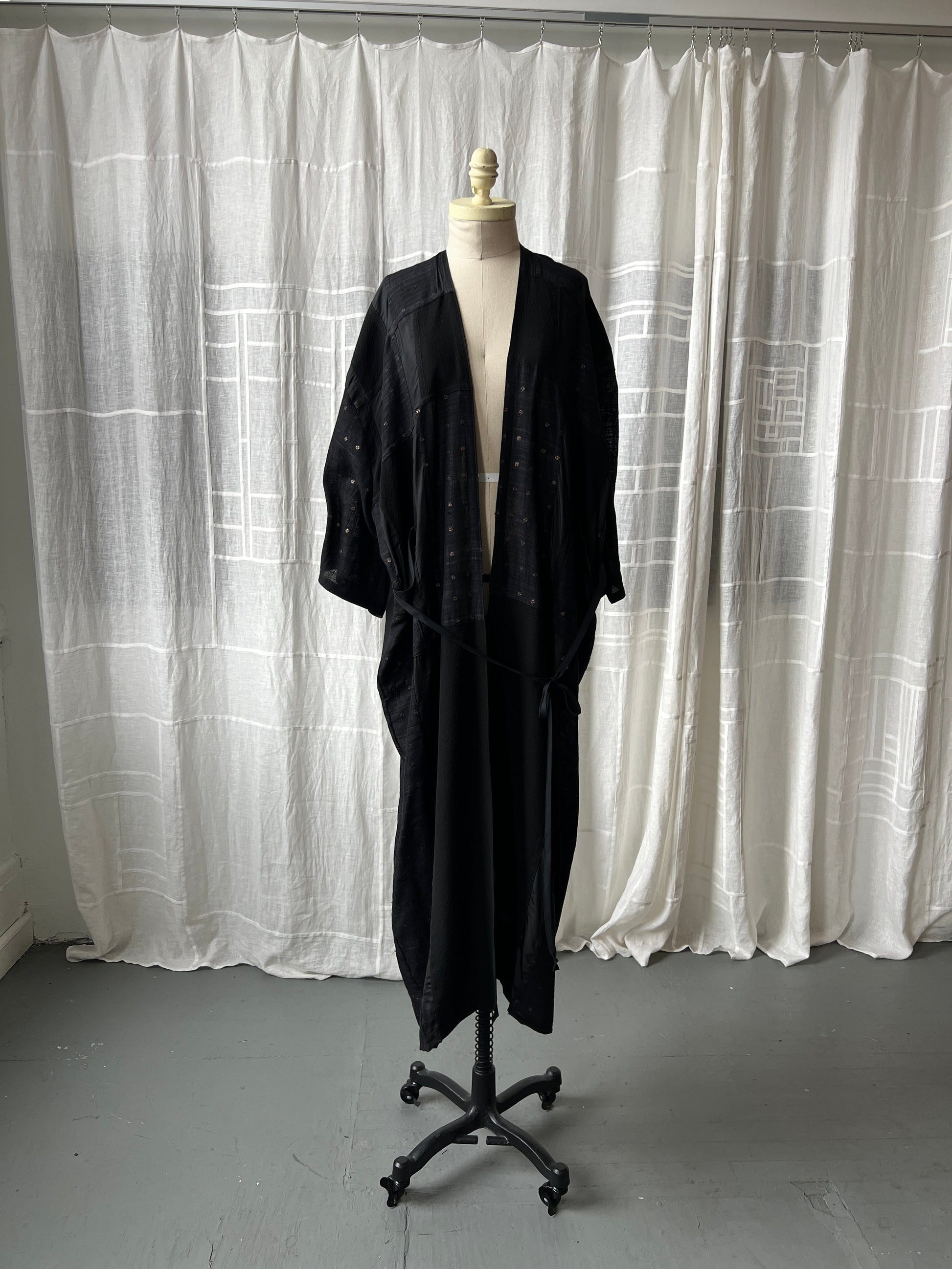 patchwork robe in hand woven sequin matka silk, vintage kimono silk, and mulberry silk