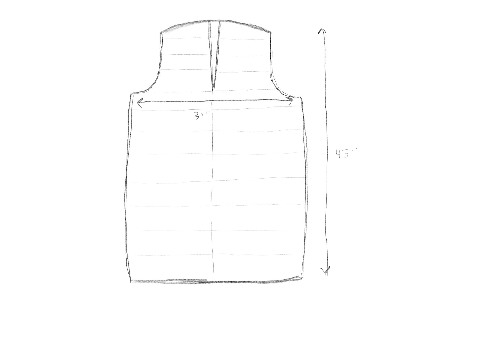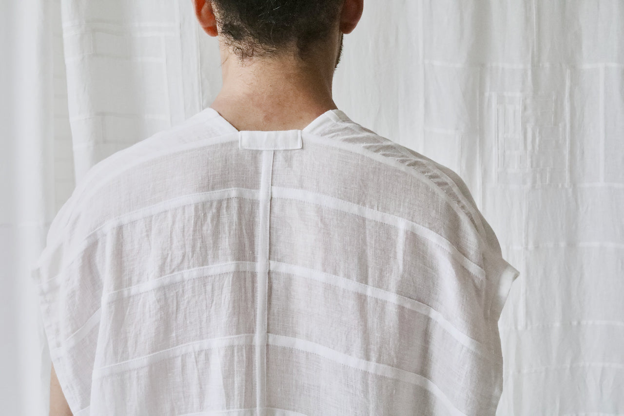 sleeveless v-neck caftan dress in bleached linen gauze. horizontal stripe pattern created with flat felled seam patchwork.