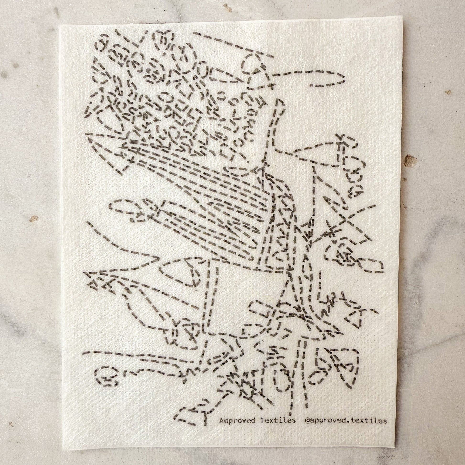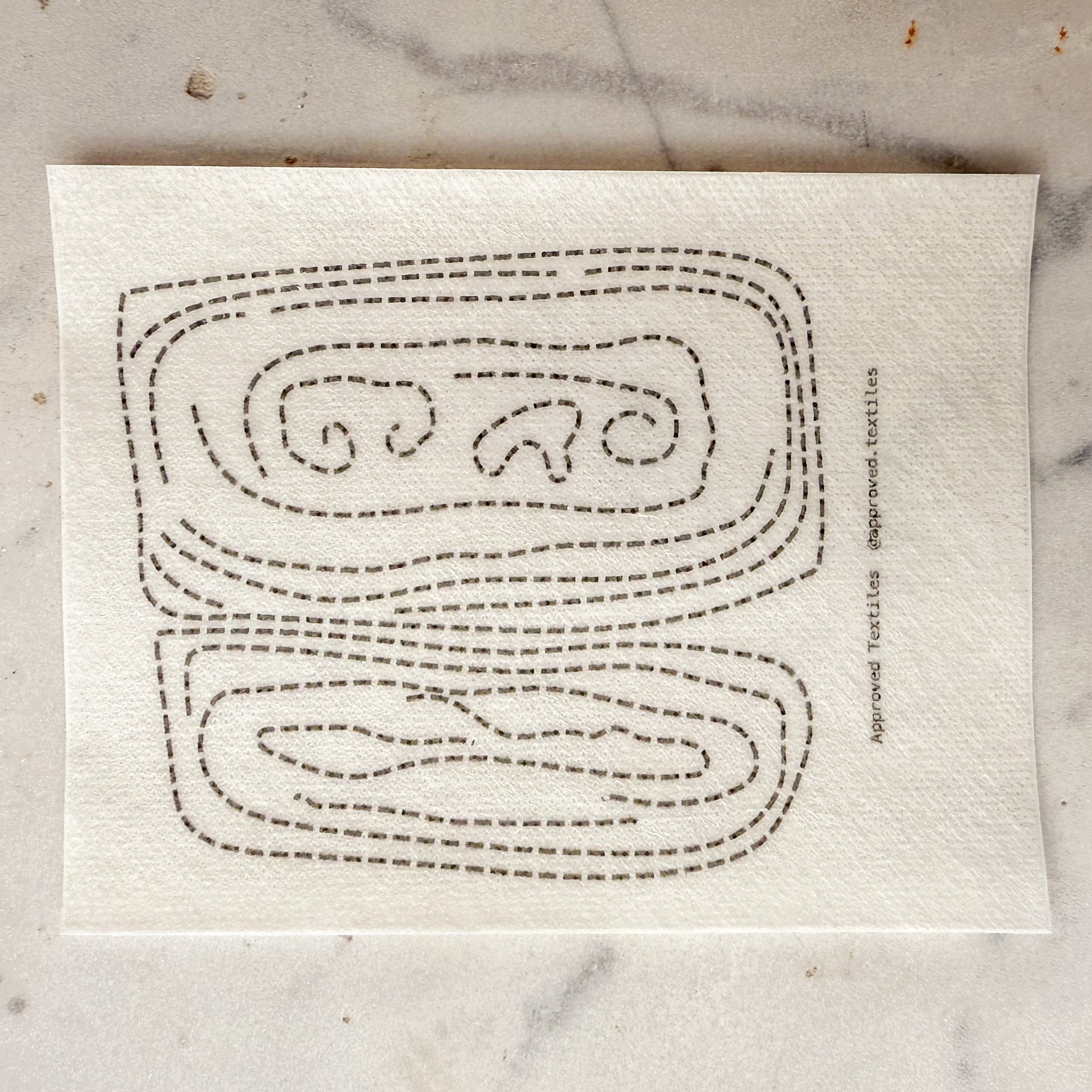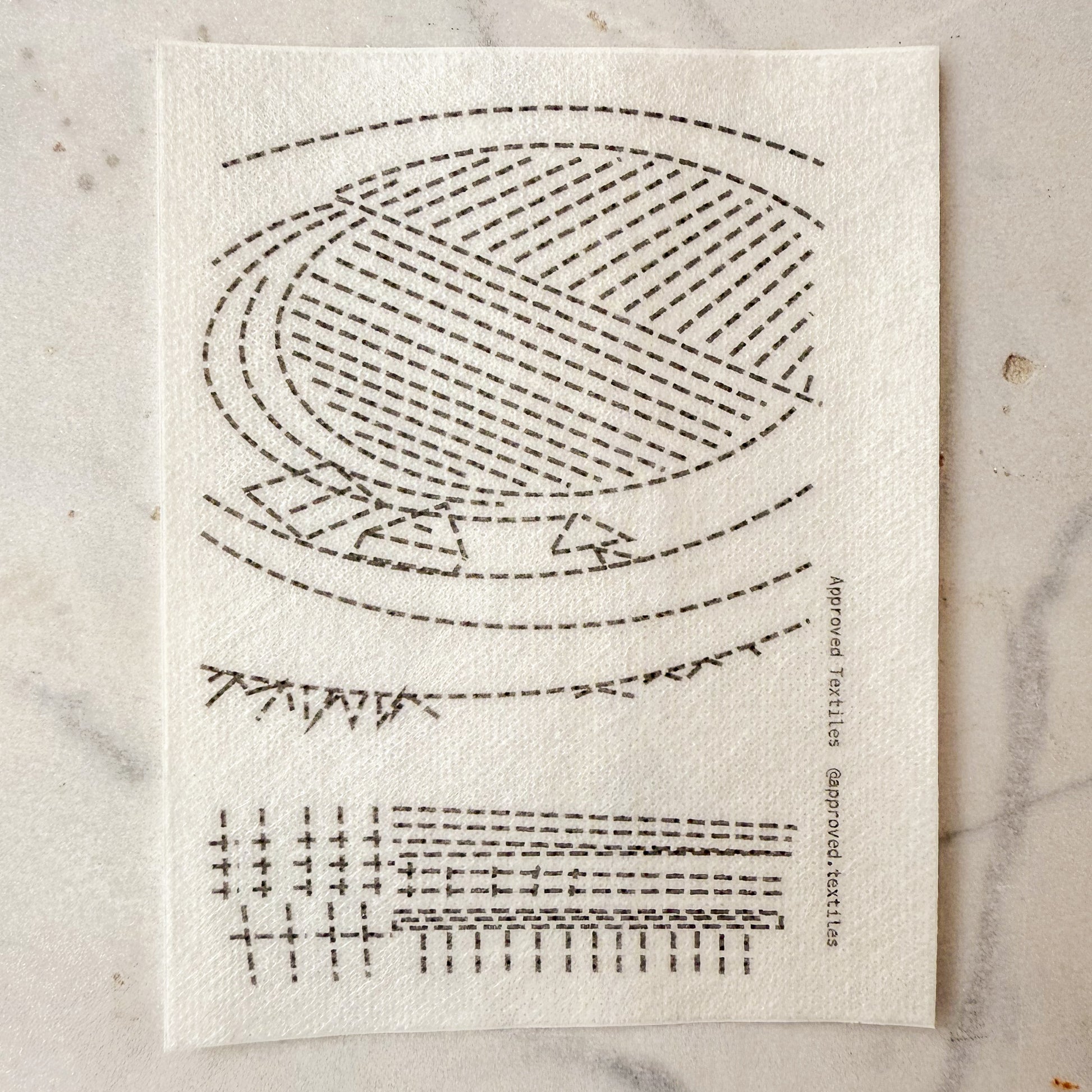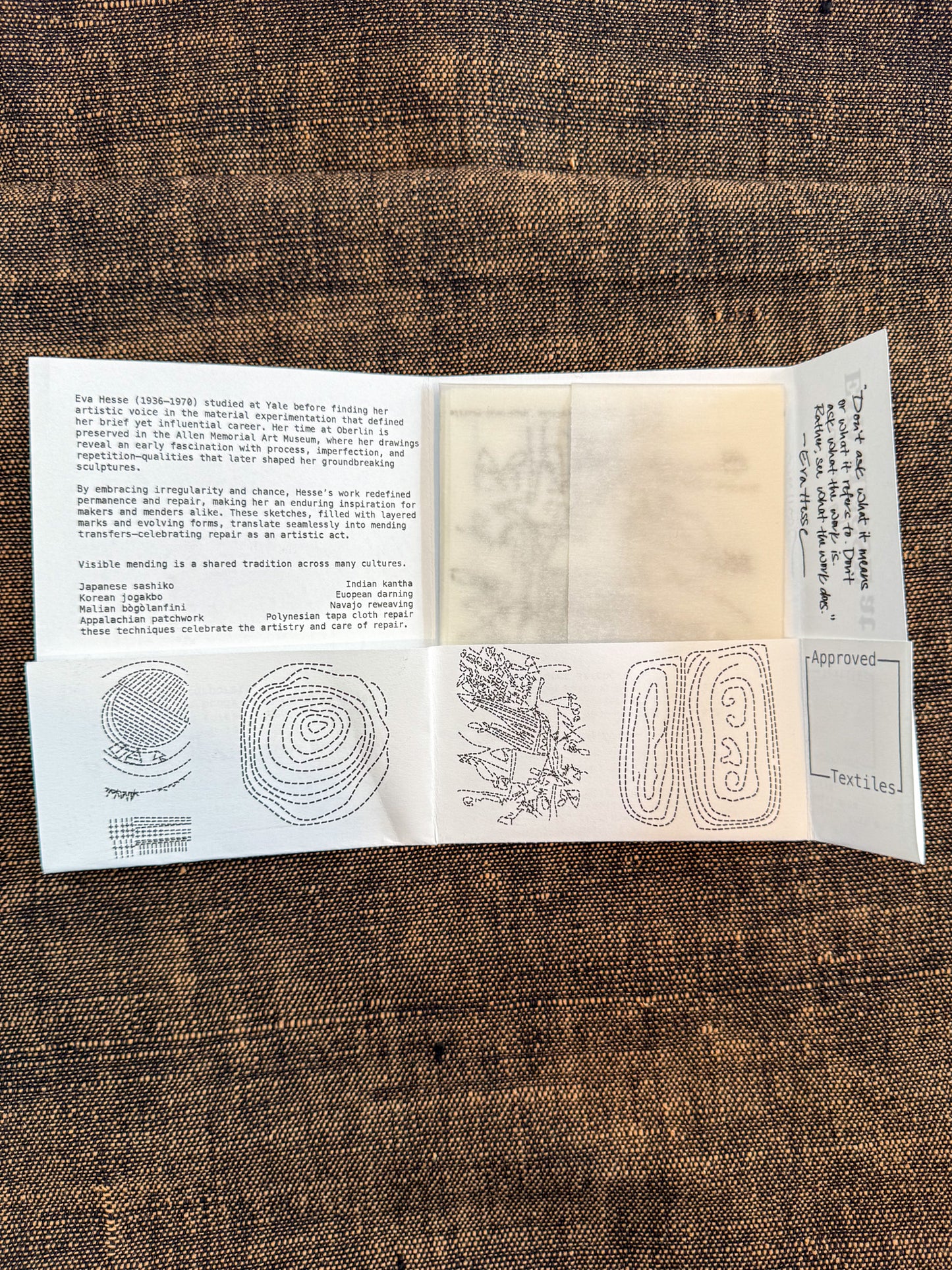 Eva Hesse’s time at Oberlin shaped her approach to materiality, process, and imperfection—values that align beautifully with the art of visible mending. This booklet offers a collection of mending transfer patterns inspired by her early drawings and experimental forms. By layering texture and repetition, these transfers invite stitchers to engage with repair as an act of transformation, much like Hesse did in her sculptural work. Printed on water-soluble stabilizer for easy application, these designs honor her raw, process-driven approach to art.