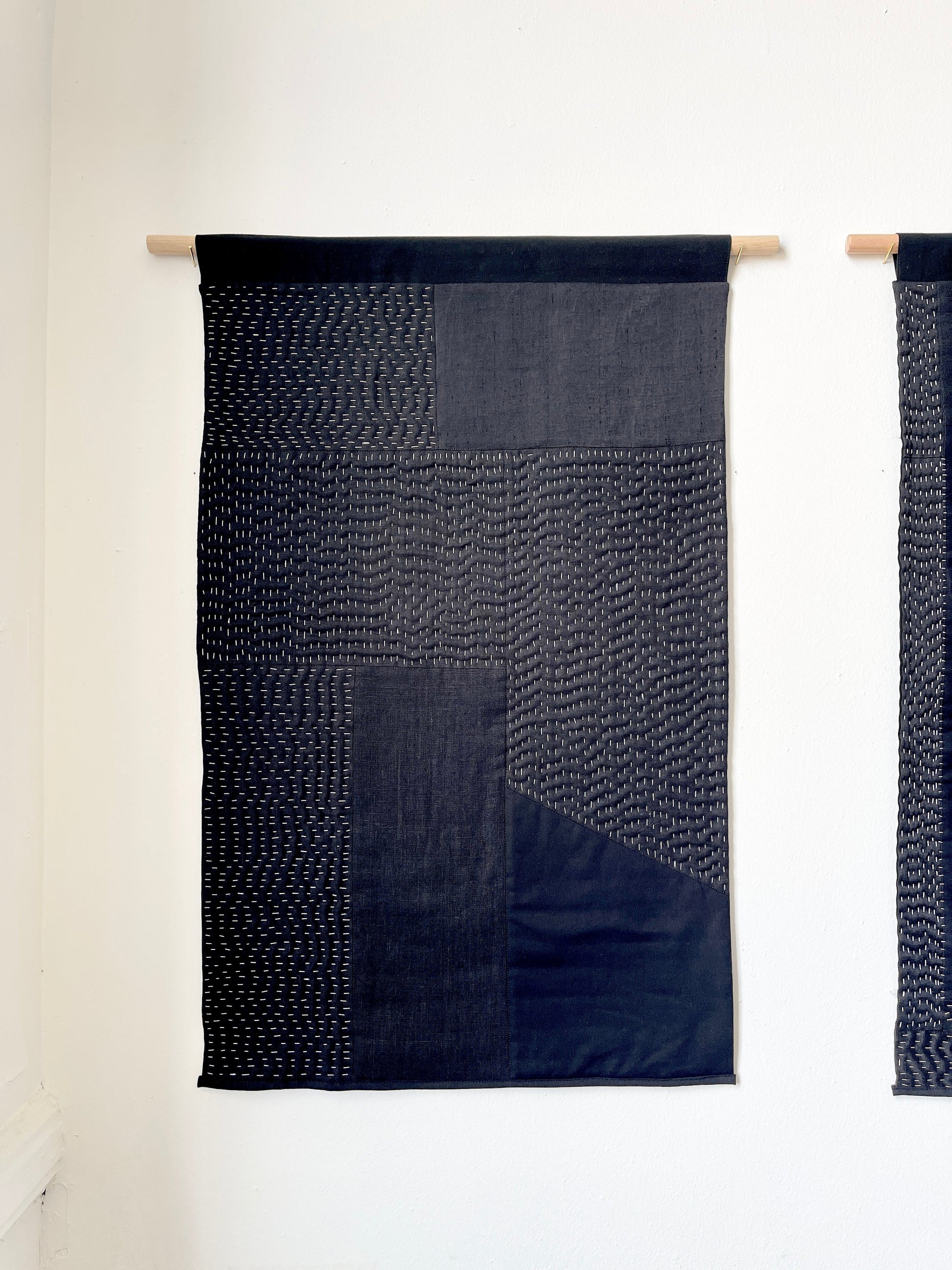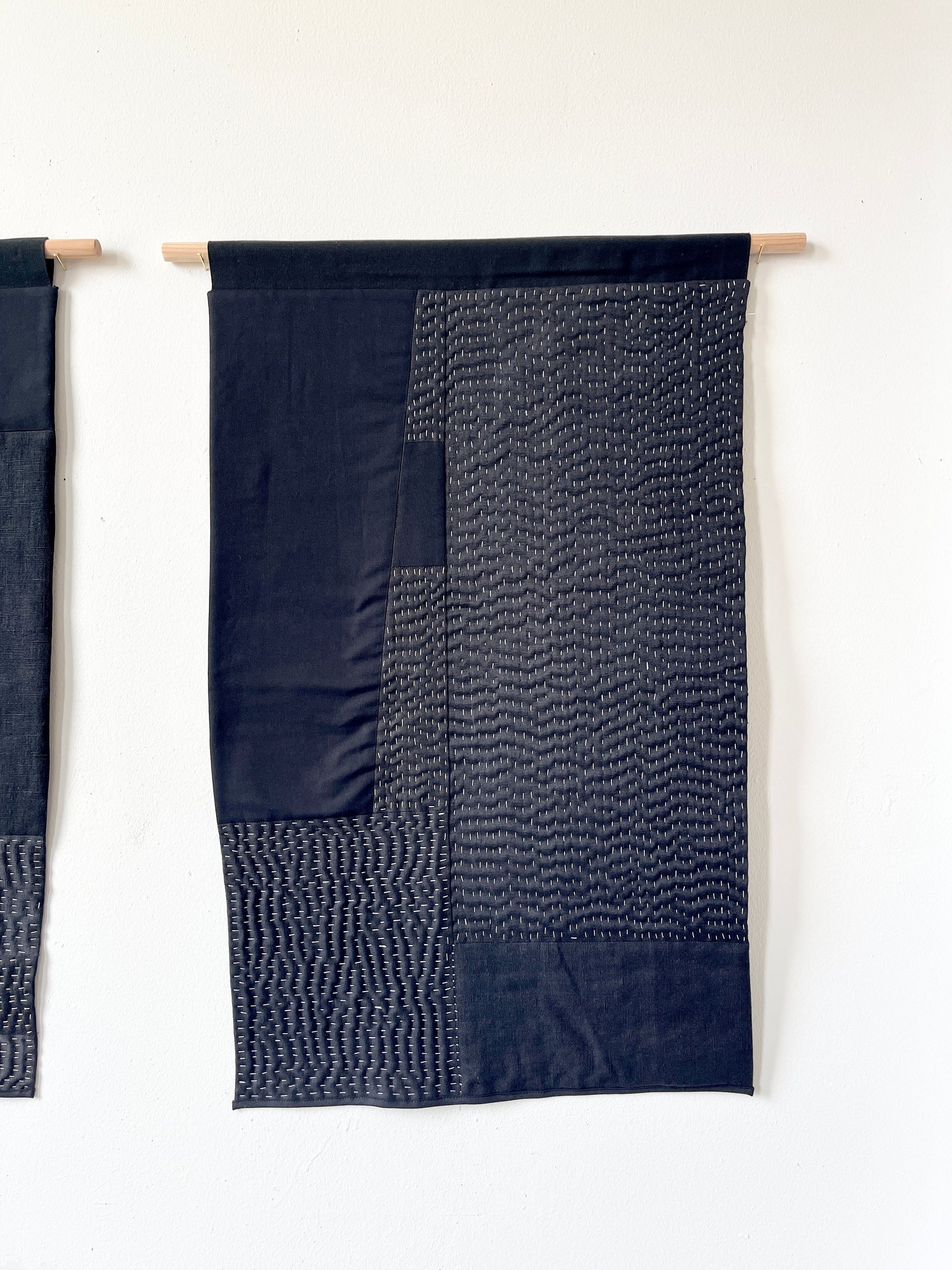 free form quilt studies in dead stock cotton, silk, and linen, quilted with polyester thread and organic cotton batting.