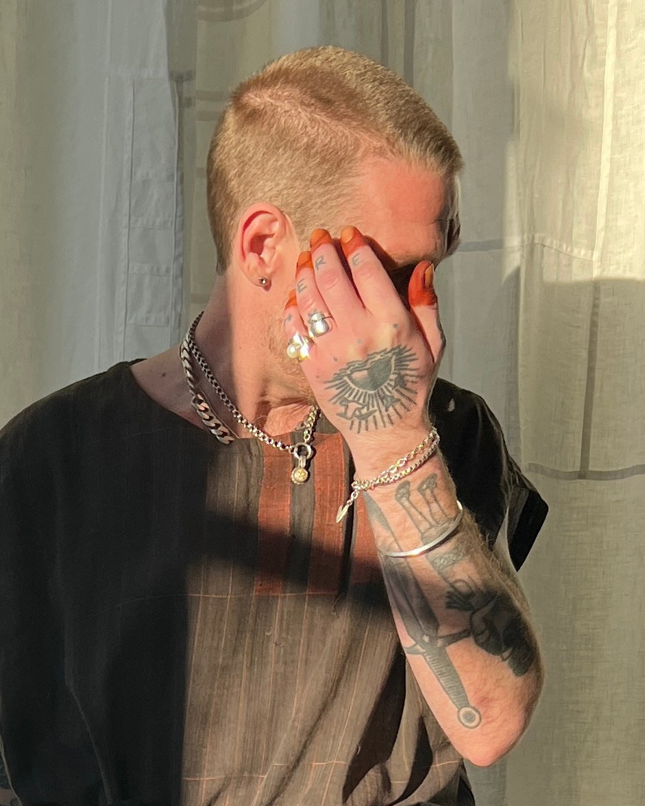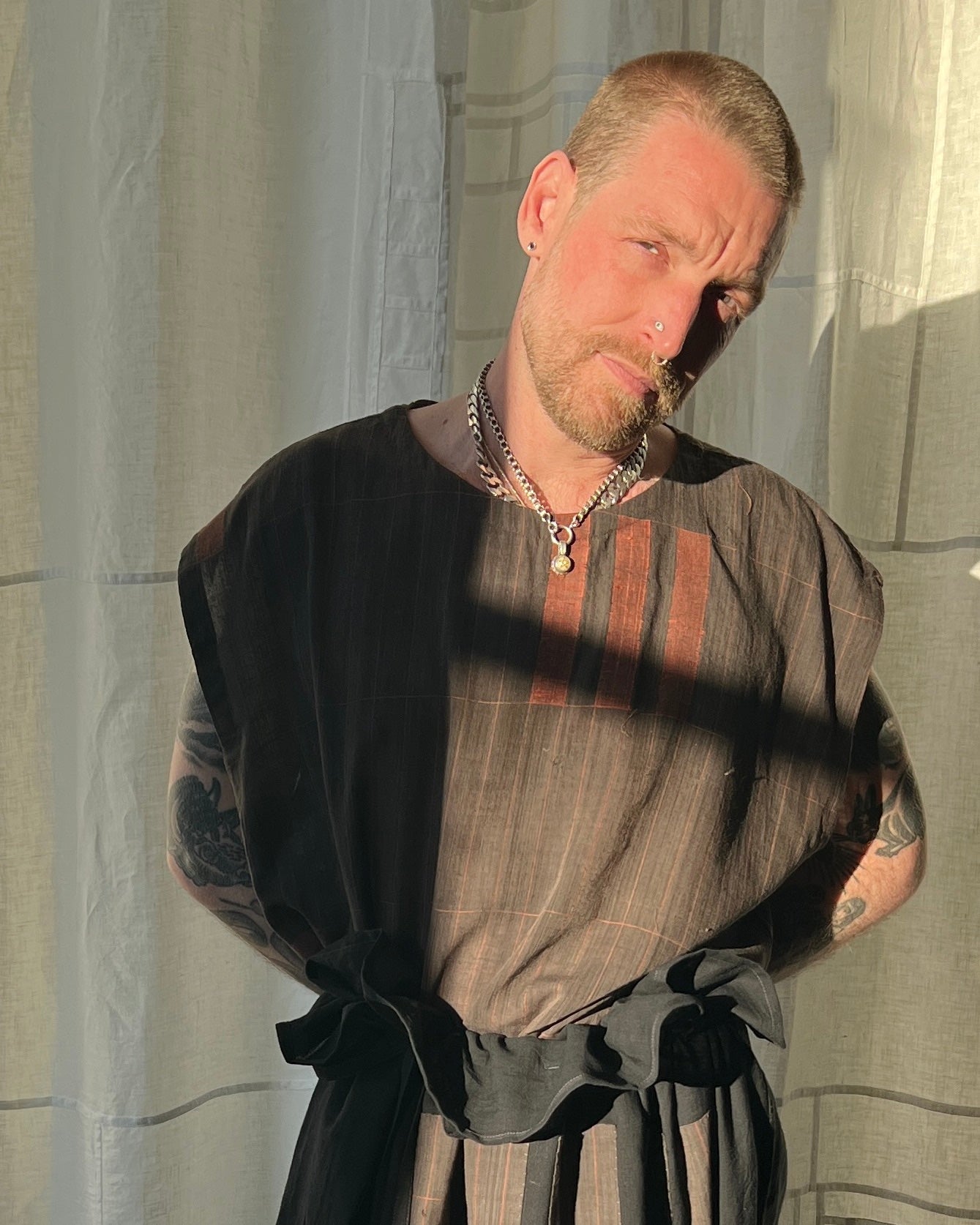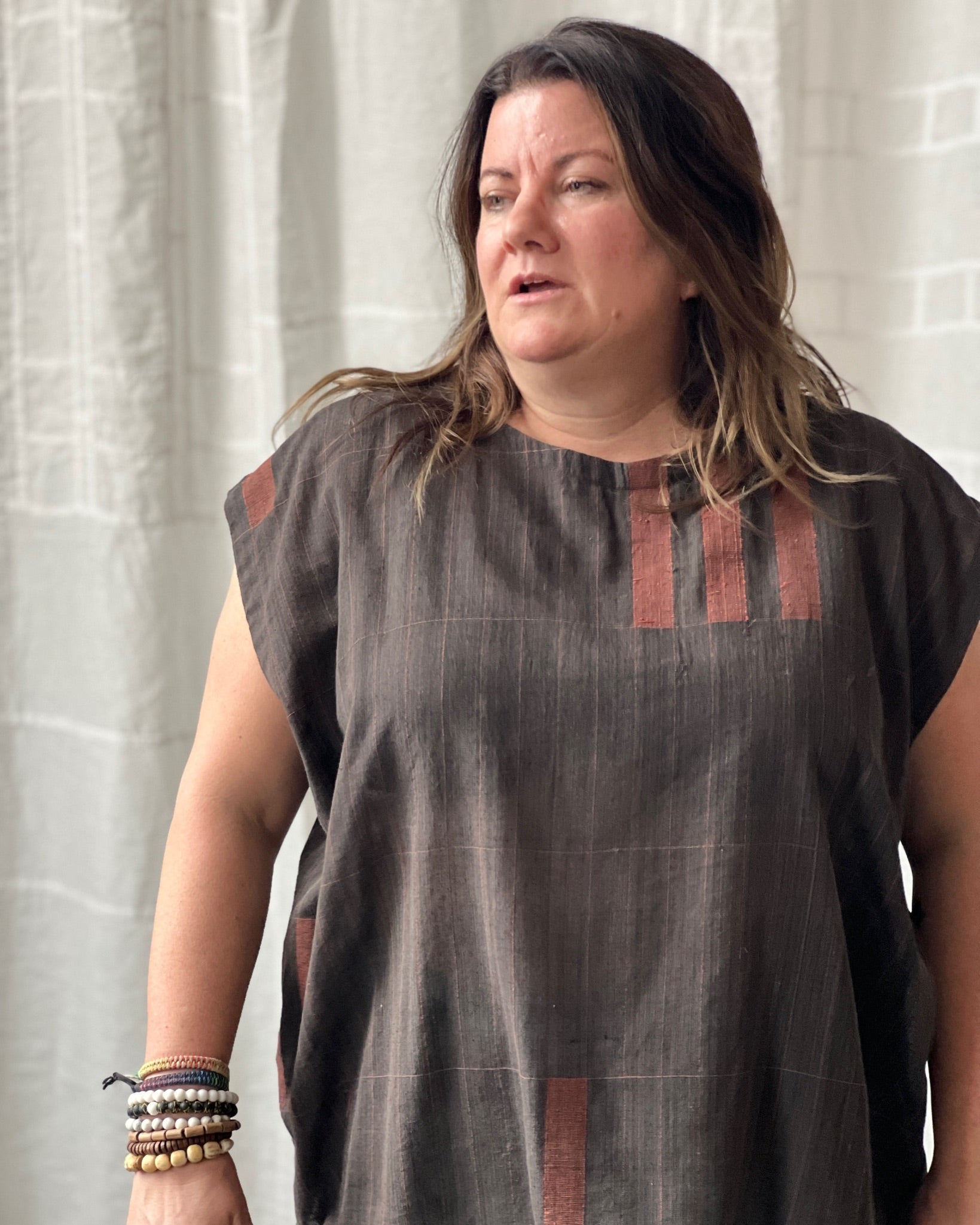 cotton and silk noil dyed charcoal with natural dye and woven on hand loom in West Bengal. elongated madder root dyed grid is a technique called jamdani, an intricate embroidery done by skilled artisans during the weaving process.
