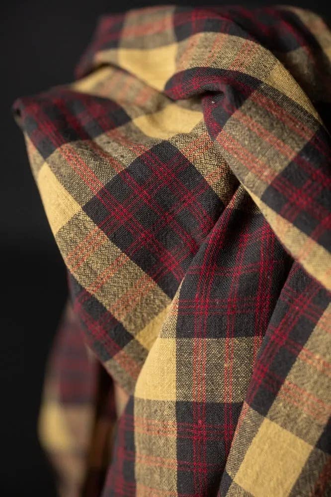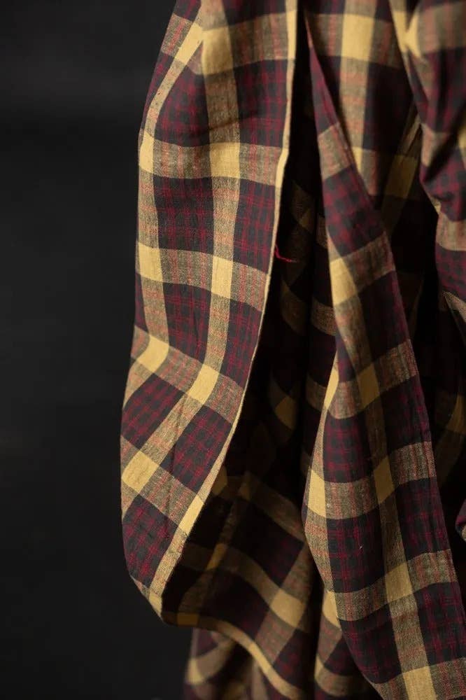 A warm toned check in charcoal grey, pale mustard and red. Handwoven with Kala cotton. Kala cotton is a purely rain fed cotton indigenous to the Kachchh region of India. It is grown in a sustainable way due to the resilient nature of the plant, the use of pesticides or synthetic fertilizers are not needed. It forms a strong and coarse fibre that produces a uniquely textured cloth. This cloth would make beautiful skirts, dresses, tops.
